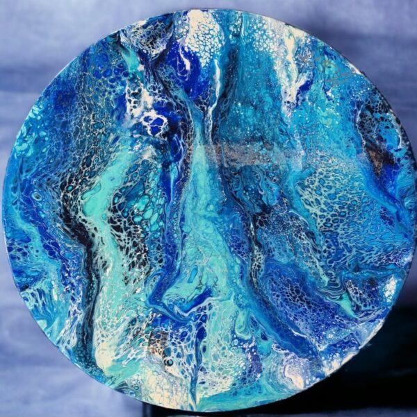 Deze houten schijf is gedecoreerd met acrylgiet techniek en afgelakt met PU lak voor extra bescherming.
