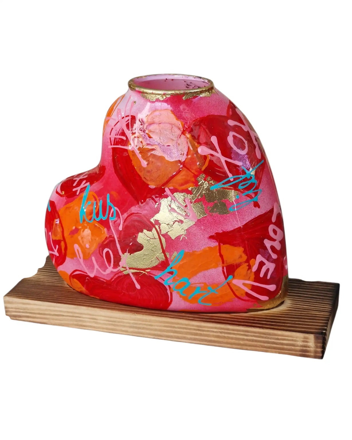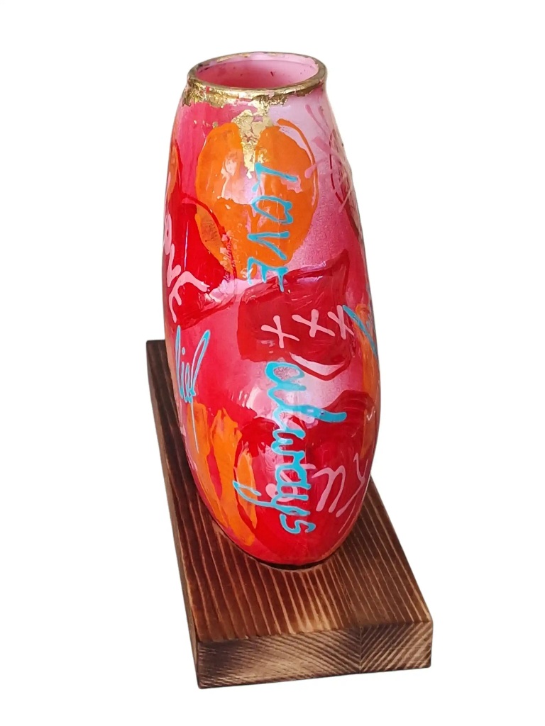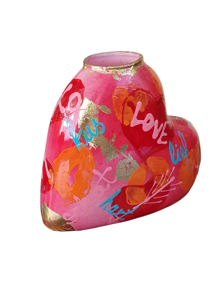 Dit vaasje is gemaakt van nieuw glas en is met de hand beschilderd. De combinatie van vorm, kleur en tekst zorgt voor een liefdevolle uitstraling die je niet in standaard woondecoratie vindt.