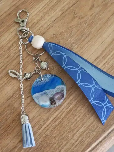 Elke sleutelhanger is een origineel kunstwerk, met zorg gegoten in epoxyhars en afgewerkt met een ketting en ring. Ideaal als betekenisvol cadeau of een persoonlijk accessoire.