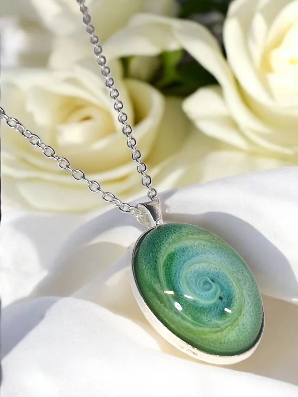 Deze met liefde handgemaakte resin hanger van IzArtShop is een uniek en stijlvol sieraad. De ovale hanger van ca. 4 x 3 cm is vervaardigd uit resin en metaal, met prachtige kleurschakeringen in groen tinten. Geen massaproductie, maar een zorgvuldig gemaakt uniek kunstwerk dat je altijd bij je draagt.
