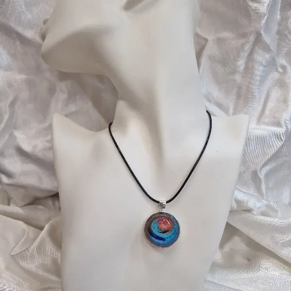Met liefde voor jou gemaakt – deze kleurrijke ronde hanger is een handgemaakt sieraad met een uniek kunsthars- (resin) patroon, op een roestvrijstalen (RVS) plaatje.
