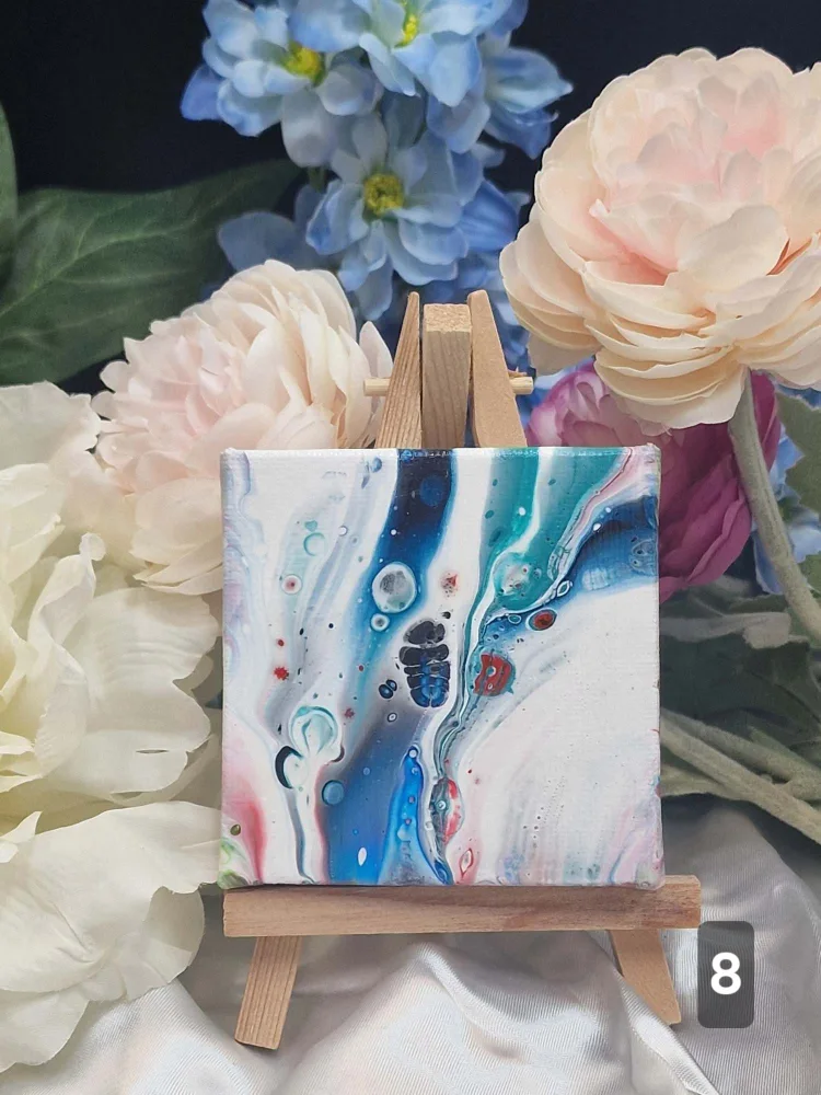 Verras iemand op een originele manier met een kunstzinnig mini canvasje van 9 x 9 cm, handgemaakt met de acrylgiet-techniek. Elk doekje is uniek, vol kleur, beweging en emotie – een klein abstract kunstwerkje dat blijft verrassen én bewaren.