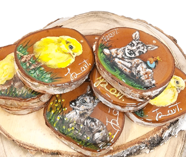 Elke hanger is beschilderd met acrylverf, afgewerkt met een glanzende laag epoxy en voorzien van een touwtje met kralen. Perfect als sfeervolle lente- of Paasdecoratie, of gewoon als een klein kunstwerkje voor jezelf of als cadeau.