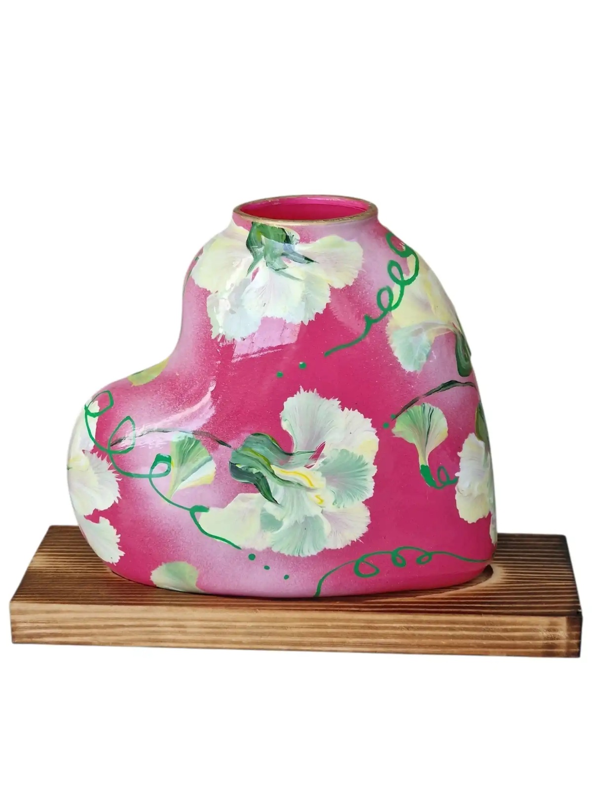 Dit roze vaasje met bloemen is een handbeschilderd en uniek decoratief object. Het is een klein kunstwerk vol zachtheid en verfijning. Het heldere glas is met de hand beschilderd in zachte roze tinten en verrijkt met bloemmotieven die een gevoel van rust, schoonheid en natuurlijke elegantie uitstralen.